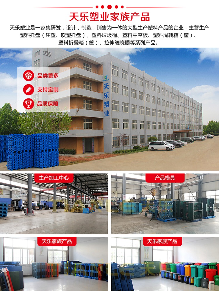 天樂塑業(yè)是一家集研發(fā),設計,生產,銷售為一體的大型塑料制品的企業(yè),公司擁有大型注塑吹塑設備、托盤焊接設備十多臺,截止目前產品模具多達七八十種,產品規(guī)格品類繁多,公司擁有經驗豐富的設計研發(fā)人才、設備維保技師,可提供產品顏色、重量、logo等定制服務、代加工服務。公司主營生產:塑料托盤、塑料垃圾桶、塑料周轉箱(筐)、塑料折疊箱、PP中空板、拉伸纏繞膜等系列產品。